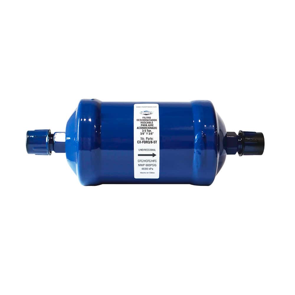Filtro Deshidratador Roscable 3/8 y 3/8 para Aire Acondicionado, Unidireccional, 3-5 Ton. Diseñado para ofrecer una protección efectiva y duradera a sistemas de aire acondicionado de alta capacidad, con aplicaciones entre 3-5 toneladas. Este filtro unidireccional se instala en la línea de líquido para eliminar humedad, ácidos y partículas que podrían dañar el compresor o causar fallas en válvulas de expansión.
