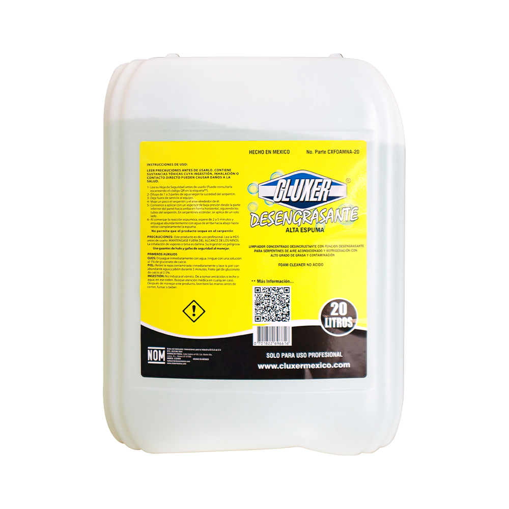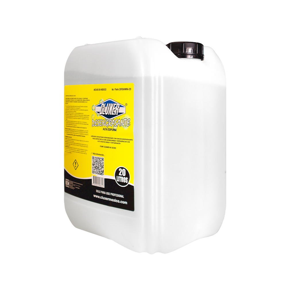 Desengrasante No Ácido Porron 20L. Limpiador concentrado de alta espuma y base alcalina, para serpentines de aluminio de alto contenido de grasa, aceite y contaminación. Ideal para equipos de aire acondicionado, refrigeración, ventilación campanas de cocina y demás artículos del hogar con grado de grasa. Su fórmula genera una espuma activa que penetra en las aletas de los serpentines del equipo eliminando así grasa, suciedad y cualquier contaminante que pueda dañarlo.
